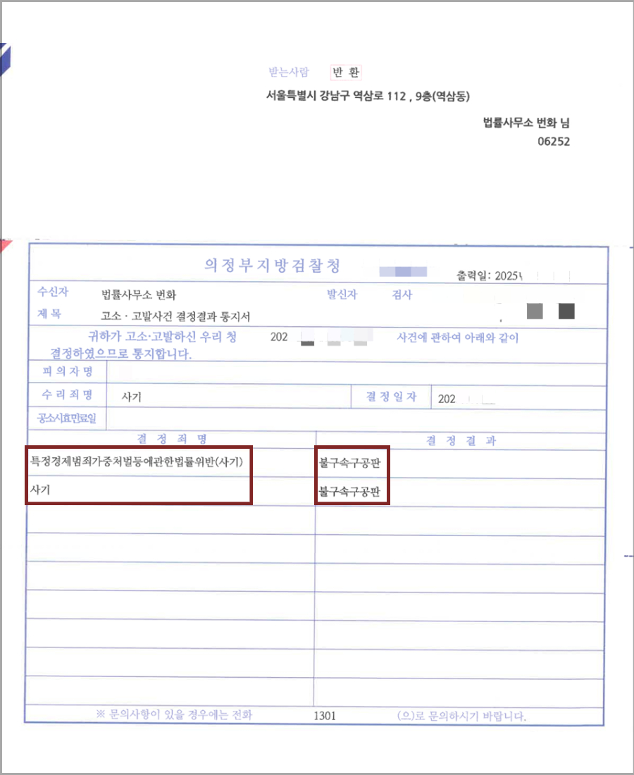 결국 의뢰인 D의 고소로 인하여 의뢰인 D는 상대방과 합의를 진행할 수 있었고, 나아가 상대방은 '특경법상 사기, 형법상 사기' 범죄사실에 대하여 불구속구공판결정이 내려졌습니다.