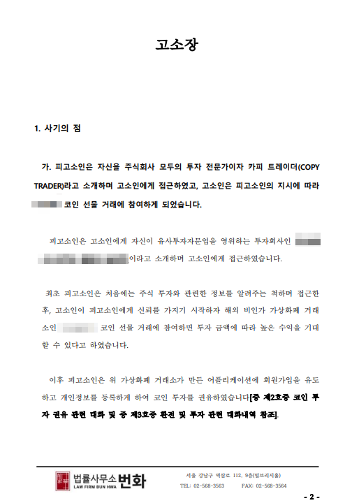 의뢰인은 자신을 유사투자 자문업을 영위하는 ◇◇ 투자회사의 팀장이며 카피 트레이더(COPY TRADER)라고 소개한 乙의 권유에 따라, 자신이 직접 또는 乙에게 위임하여 비인가 해외거래소에서 선물투자를 진행하였습니다.