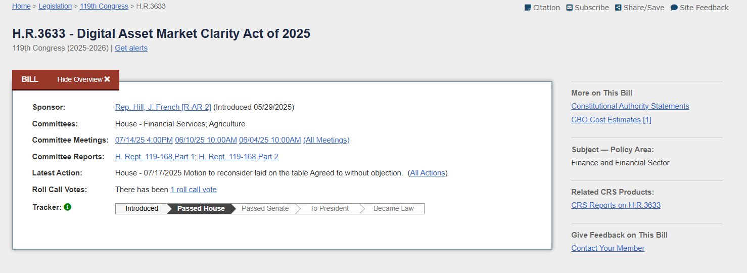 2025년 7월, 미국 하원은 디지털 자산 규제의 큰 전환점이 될 H.R.3633 Digital Asset Market Clarity Act of 2025를 통과시켰습니다.