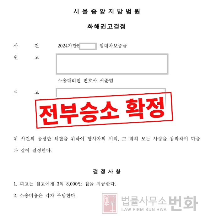 본 건과 같은 반환 청구 사건의 경우 결국 상대방의 자력 유무가 굉장히 중요하기 때문에 상대방의 재산을 검토하는 절차를 거쳤습니다. 이후 이 사건과 관련하여 상대방이 반박할 수 없도록 만들고 결국 소장을 접수한 지 3개월이 지나기도 전에 법원의 화해권고결정을 받아 결정이 '확정'되었습니다.