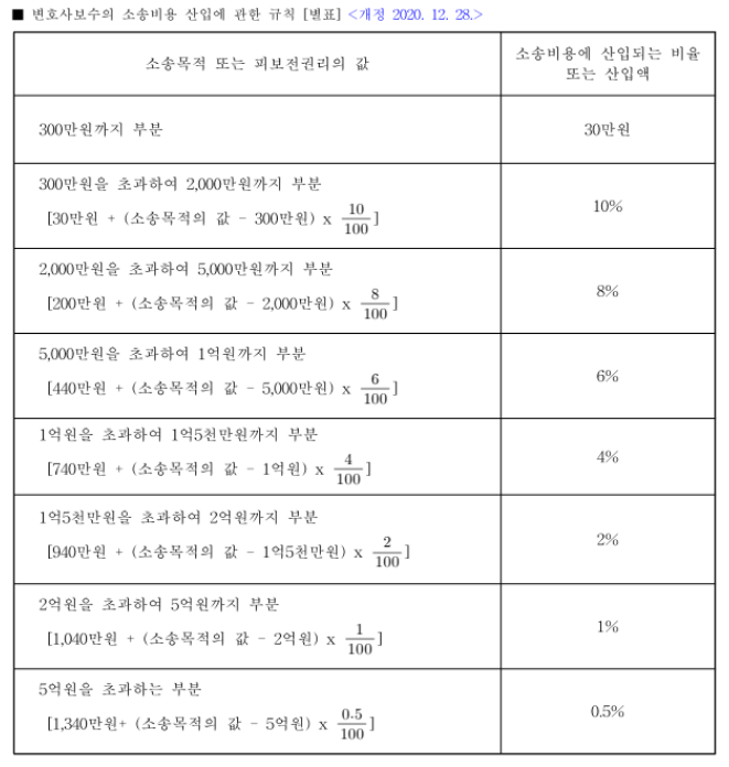 중요한 것은 변호사비 관련된 것일텐데요 법정 변호사 보수액 한도는 '변호사보수의소송비용산입에관한규칙'에 따라 정해지고 있습니다. 해당 규칙의 별표에서는 소가에 따른 법정 변호사 보수액 한도 계산표를 만들어 놓았습니다.