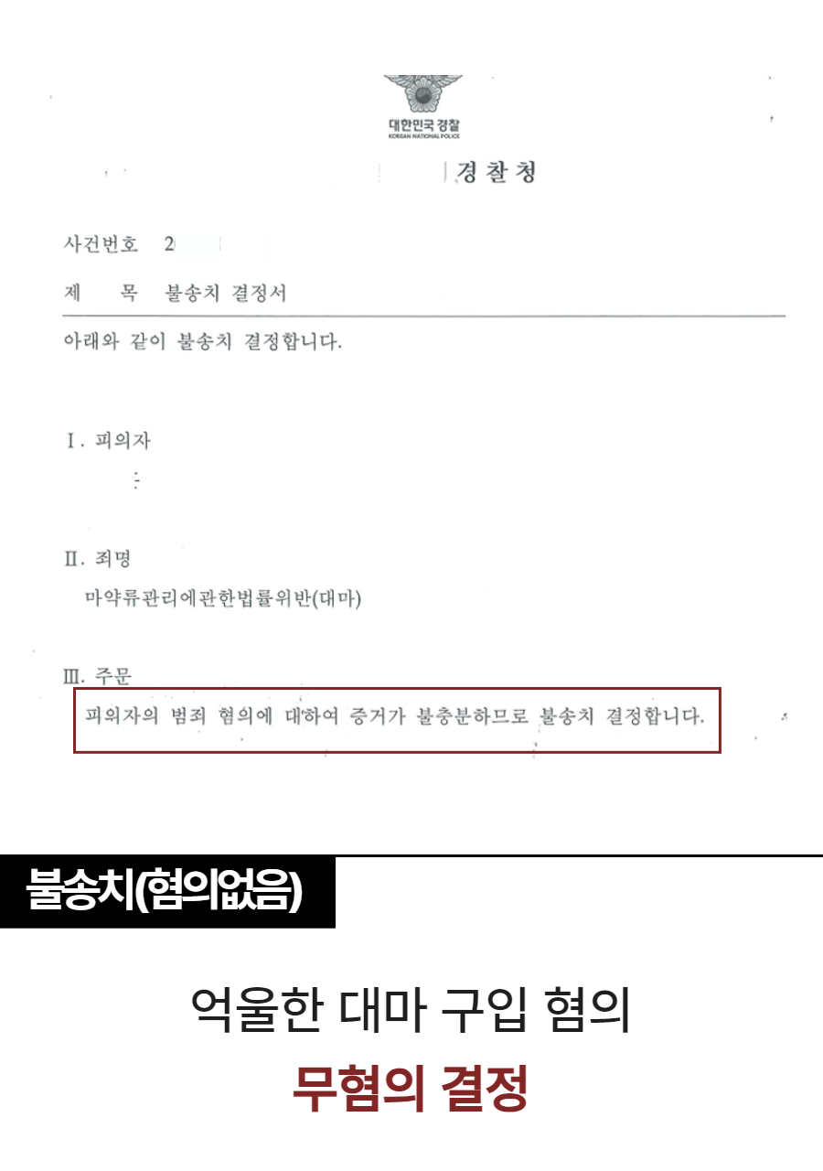 의뢰인은 마약이나 대마와 같은 불법적인 물품을 구매하기 위하여 비트코인을 전달한 사실이 없었고, 의뢰인이 대마를 구매했다고 볼 증거는 판매자의 진술 정도에 불과했습니다. 판매자는 이미 너무 많은 범죄 사실을 가지고 있었기에 그 진술에 신빙성이 없다는 점을 구체적으로 주장하였고, 자발적으로 동의하여 진행한 마약 검사에서도 음성이 나왔기에 더 이상 수사가 이어지기 어려웠습니다. 결국 의뢰인의 대마 매수 부분에 대하여 불송치 결정이 나왔습니다.