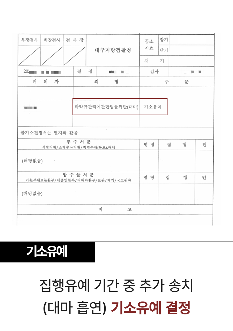 의뢰인은 이미 집행유예 기간에 있었고 대마 흡연 범죄 사실이었기 때문에 최대한 기소유예 혹은 벌금형을 받을 수 있게 사건을 진행하였습니다. 결국 범죄의 시기 및 적절한 양형 자료를 제출하였고, 본 건에 대하여 기소유예 결정을 받을 수 있었습니다.
